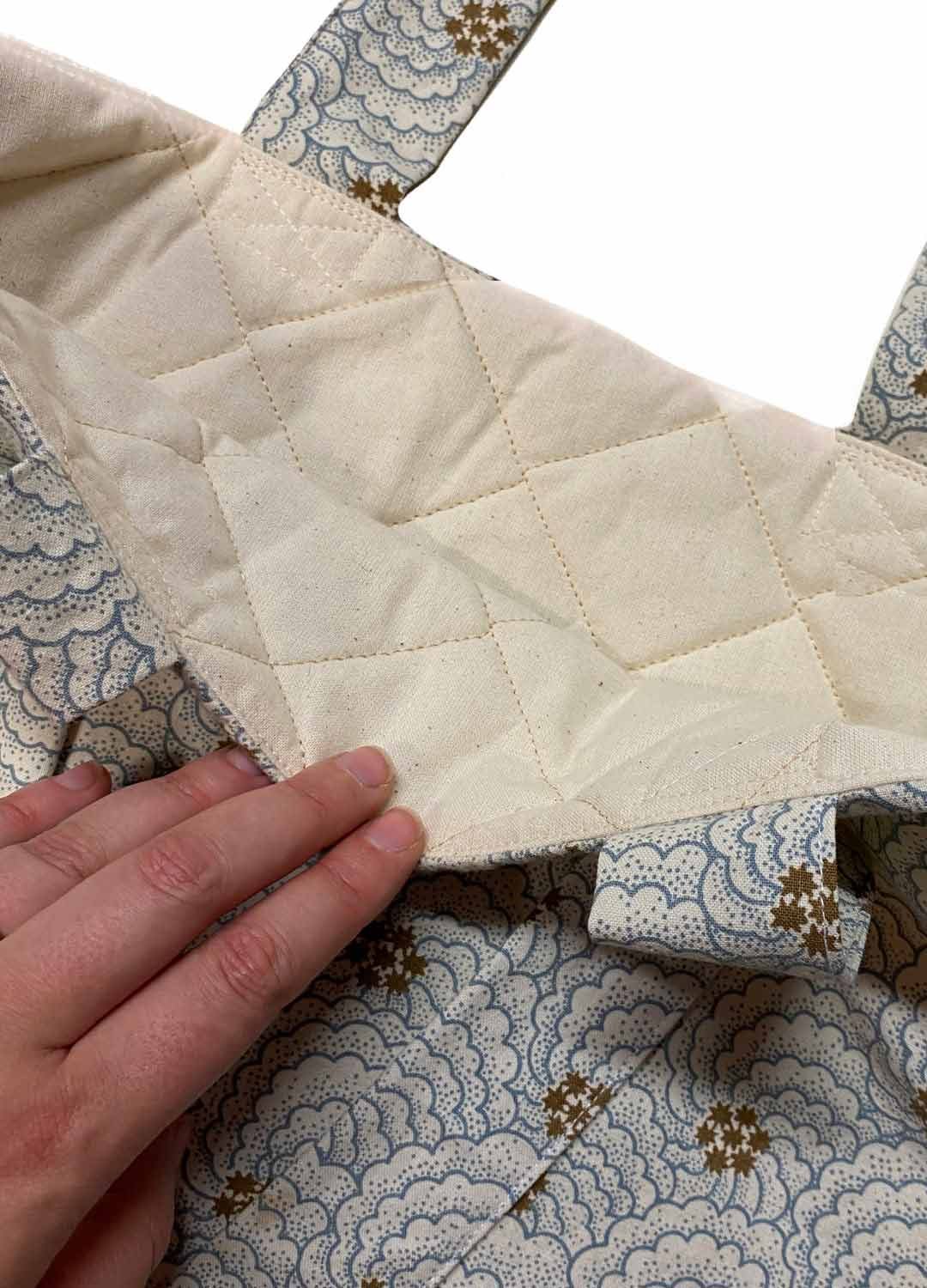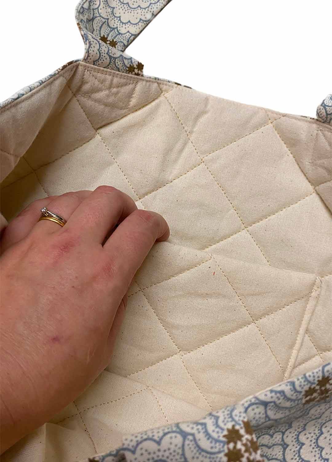 Our quilted lining is slightly padded with a raw calico surface texture