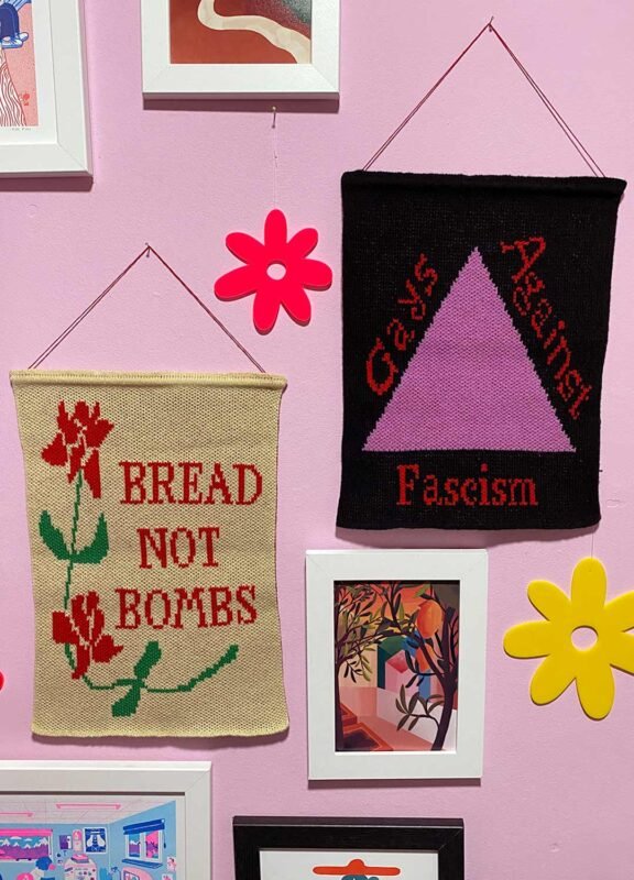 ‘Bread not bombs’ banner and ‘Gays against fascism’ banner by Knit and Destroy x The Feminist Library | £40 each